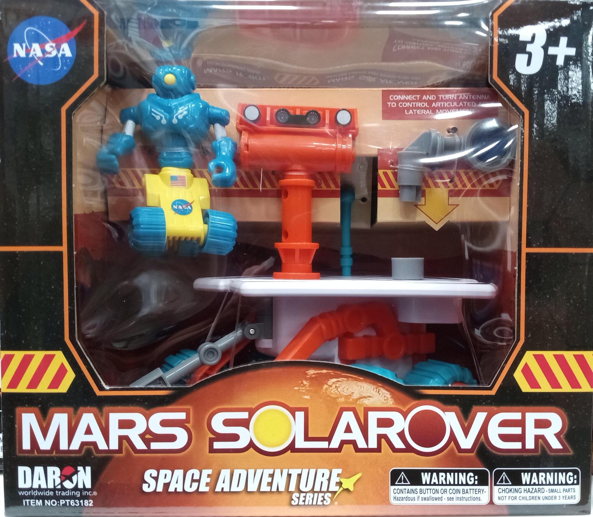 This Mars Mission Solarover is part of the Space Adventure Series. Space Exploration is a new frontier. Your child can reach the stars of their imagination with this Mars Solarover playset. Each set comes with a Mars Robot with spinning arms, spinning torso, rolling wheels. The Solarover has a spinning head with LED lights, Articulated arm with lateral control and rolling wheels. Batteries included. Ages 3+